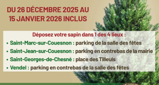 Du 26 décembre 2025 au 15 janvier 2026 inclus : opération Sapin malin à Rives-du-Couesnon 4 espaces dédiés à la récupération des sapins de Noël pour broyage et revalorisation ! Vous pourrez récupérer le broyat dans la semaine du 19 janvier à proximité des lieux de collecte dessapins. Ce type de broyat s’utilise de préférence en paillat d’allées (et non dans le potager ou sur les plantes d’ornements).