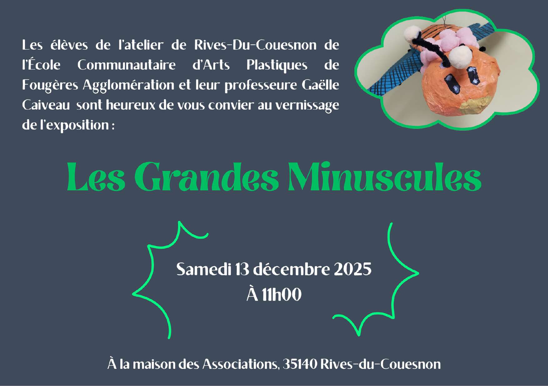 L’atelier d’arts plastiques de Rives-du-Couesnon, en lien avec L’École communautaire d’arts plastiques de Fougères Agglomération, est ravi de vous inviter à son Vernissage de l’Exposition de Noël !