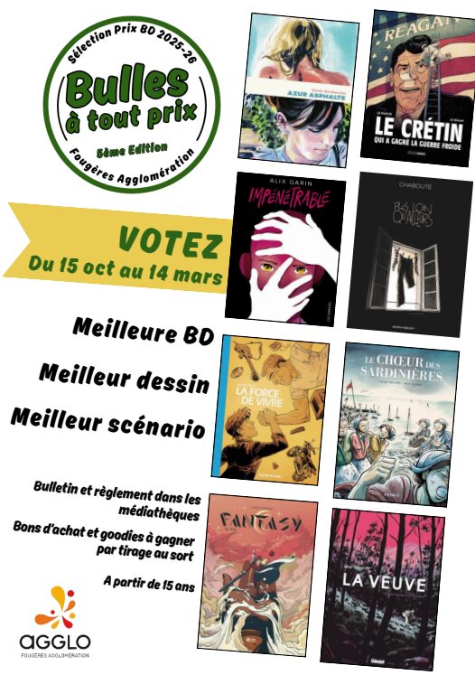 Vous avez jusqu’au 14 mars 2026 pour voter pour le 5ème prix BD « BULLES A TOUT PRIX » organisé par les médiathèques de Fougères Agglomération.