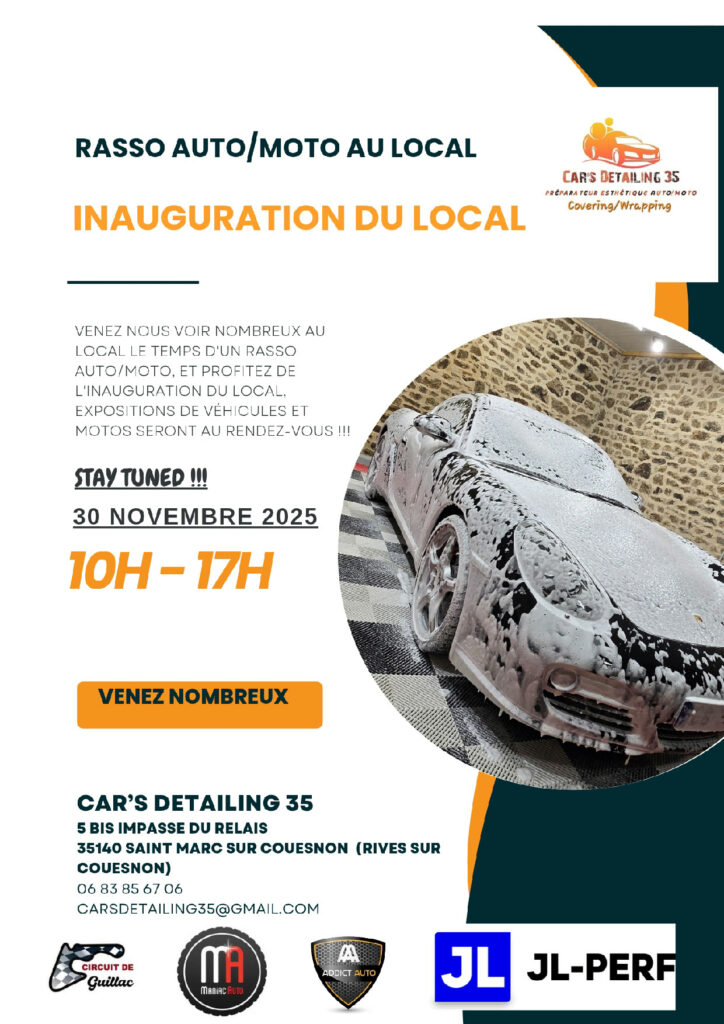 Venez nombreux célébrer l’ouverture du nouveau local Car’s Detailing 35, votre nouveau préparateur esthétique auto/moto (covering/wrapping) et participer à un grand rassemblement de véhicules.
