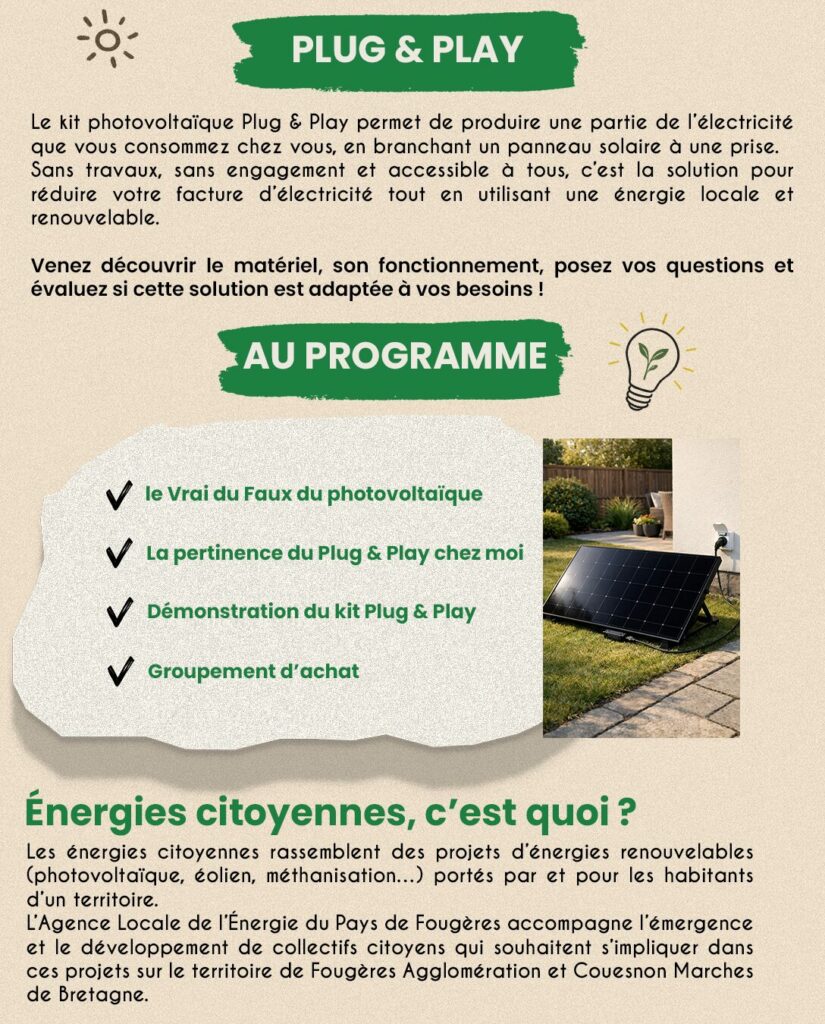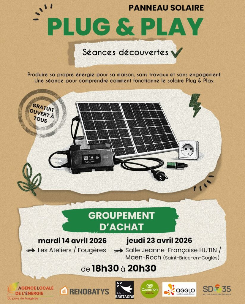 Dans le cadre de sa mission Énergies citoyennes, l’Agence Locale de l’Energie du Pays de Fougères organise deux séances découvertes gratuites ouvert à tous autour du kit de panneau solaire Plug & Play, associés à un groupement d’achat, le 14 avril à Fougères (Les Ateliers) et le 23 avril à Maen-Roch (Salle Jeanne-Françoise-Hutin / Saint-Brice-en-Coglès).
