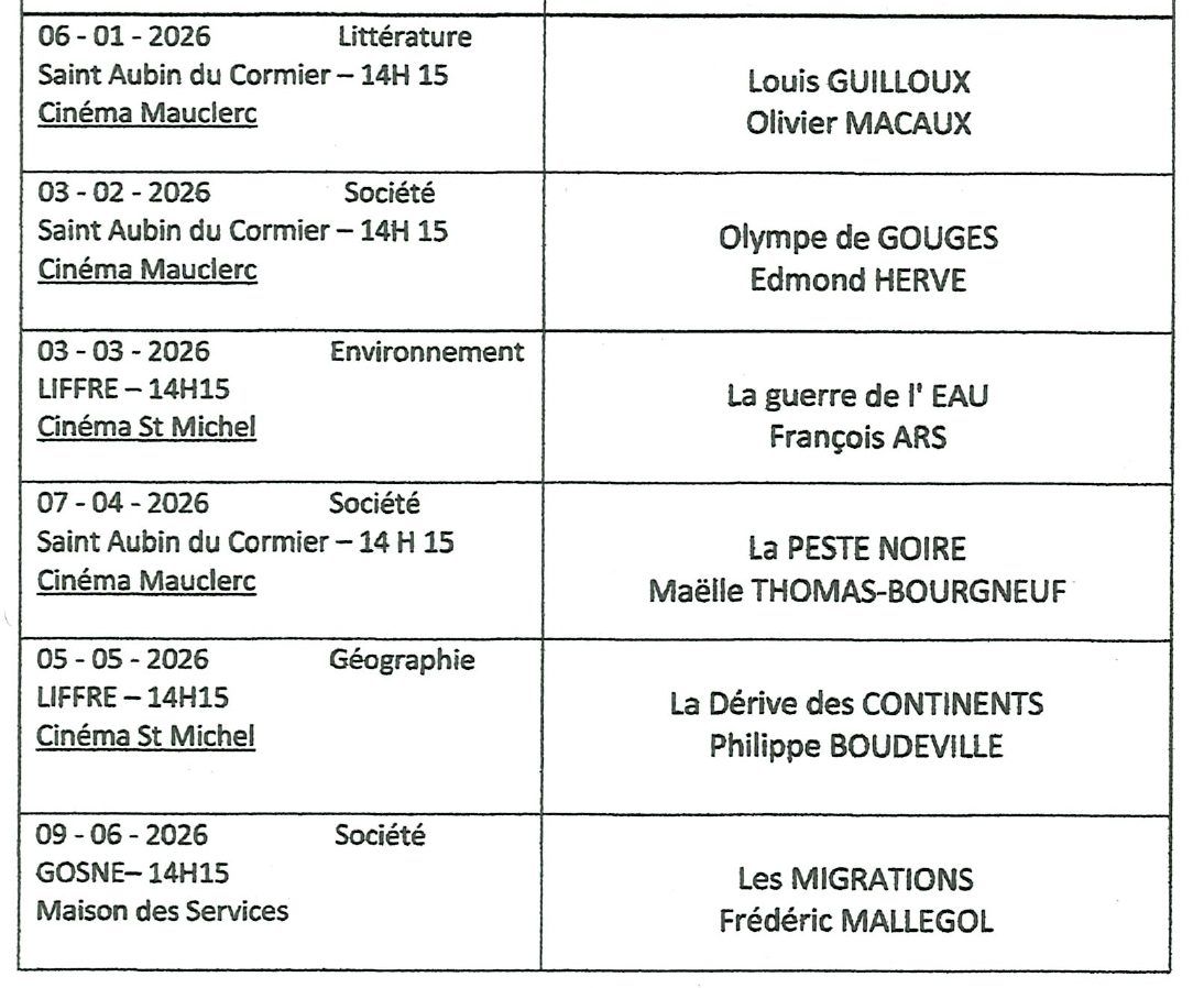 Les conférences débats (9 par an) ont lieu le mardi à 14h15. Elles se tiennent essentiellement sur St-Aubin et Liffré.