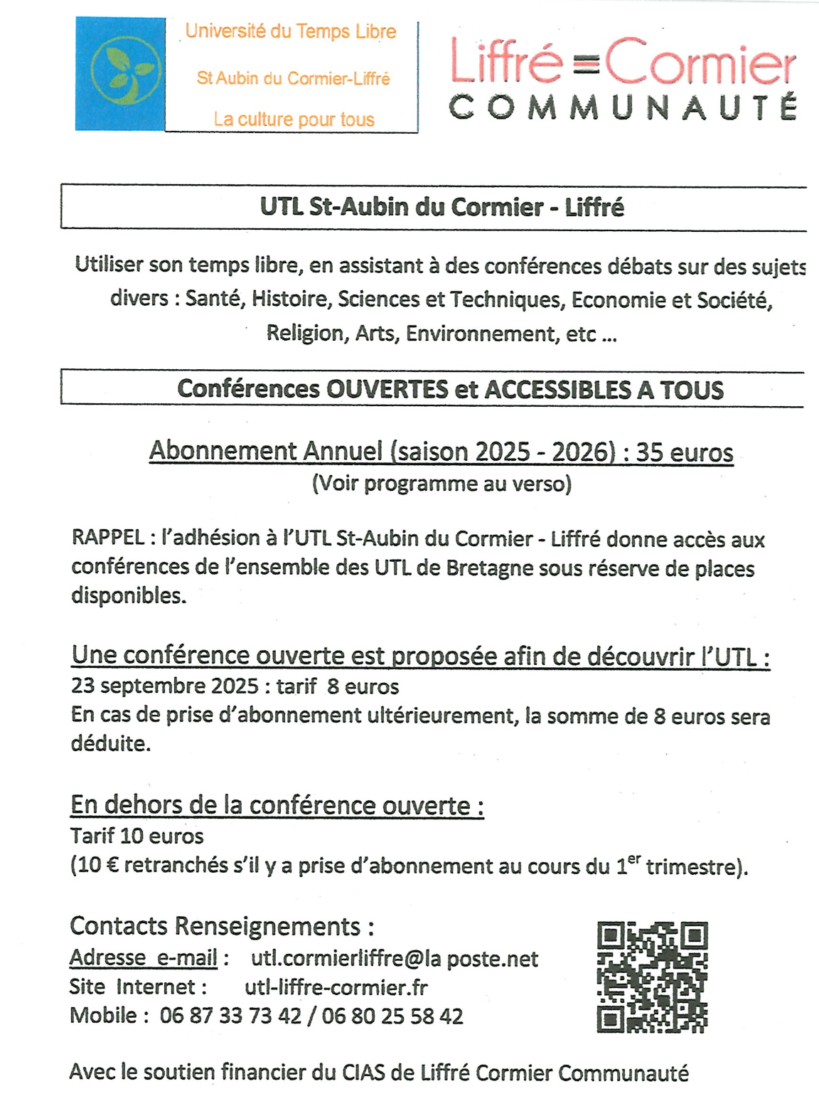 L’Université du Temps Libre (UTL) vous propose de mettre à profit votre temps libre en assistant à des conférences débats sur des sujets divers : santé, histoire, Bretagne, sciences et techniques, économie et societe, religion, environnement, arts…